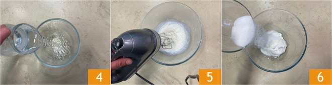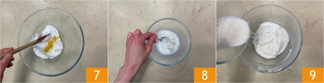 Aromatisez avec le zeste de citron râpé 7, mélangez le tout 8. Faites fondre la gélatine bien essorée dans le lait chaud, une fois la gélatine bien dissoute, versez le lait dans le mélange de ricotta 9 et mélangez bien avec un fouet.