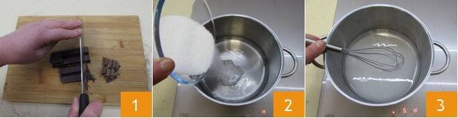 Pour préparer le gâteau à l'eau au chocolat, commencez par hacher finement le chocolat 1. Mettez ensuite les copeaux de chocolat dans un petit bol et réservez. Prenez maintenant une casserole à bords hauts et versez-y l'eau. Faites chauffer à feu doux. Lorsque l'eau commence à chauffer, ajoutez le sucre 2 et, à l'aide d'un fouet manuel, mélangez bien le sucre pour le faire fondre 3.