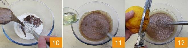 Lorsque le mélange de chocolat et de sucre aura refroidi, versez-le dans le bol avec la farine, en trois fois 10, en veillant à le mélanger énergiquement avec le fouet manuel pour éviter la formation de grumeaux et obtenir ainsi un mélange homogène. Procédez en versant l'huile en filet 11 et, une fois incorporée, râpez le zeste d'une orange 12.