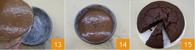 Continuez à mélanger les ingrédients. Enfin, beurrez et tapissez un moule à gâteau de 22 cm de diamètre avec du papier sulfurisé et versez-y le mélange obtenu 13. Enfournez dans un four statique préchauffé à 180°C pendant 50 minutes 14. Une fois cuit, démoulez le gâteau 15 et laissez-le refroidir complètement sur une grille. Vous pouvez saupoudrer de sucre glace avant de servir!