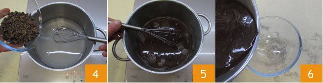 Une fois le sucre dissous, continuez à mélanger et ajoutez également le chocolat en copeaux précédemment préparé 4. Continuez à mélanger les ingrédients énergiquement avec les fouets manuels pour éviter la formation de grumeaux 5. La chaleur aidera à dissoudre les ingrédients dans l'eau. Lorsque les ingrédients seront totalement amalgamés et sans grumeaux, versez le mélange dans un bol à bords hauts ou dans le bol d'un mixeur 6.