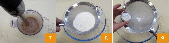 À ce stade, prenez un mixeur plongeant et mixez finement tous les ingrédients dans le bol 7. Puis laissez refroidir à température ambiante. Ensuite, prenez un bol et tamisez la farine 8 et la levure 9.