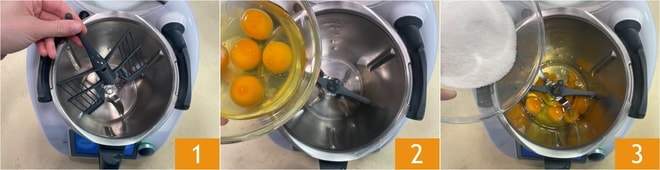 Pour préparer le gâteau au chocolat et aux cerises avec Bimby®, commencez par la génoise au cacao : insérez le fouet dans le bol du Bimby® 1, puis ajoutez les œufs 2 et le sucre 3. Fermez avec le couvercle et montez à vitesse 4 pendant 15 minutes.