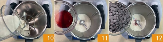 Entre-temps, préparez la ganache : versez dans le bol du Bimby® 400 g de crème 10 et démarrez en mode Chauffage à 90°. Une fois la température atteinte, ajoutez le sirop de cerises 11 et le chocolat noir 12.