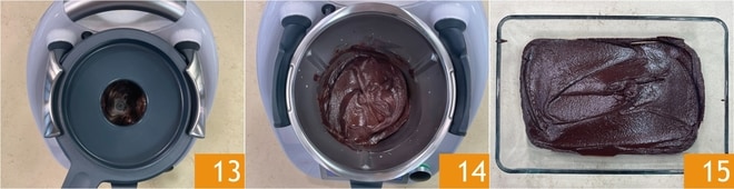 Fermez et actionnez à vitesse 4 pendant une minute 13. La ganache est prête 14 : transférez-la dans un plat bas et large, nivelez la surface 15 et couvrez avec un film plastique au contact, puis placez au réfrigérateur pour refroidir.