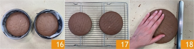 Une fois le temps de cuisson de la génoise écoulé, vérifiez avec un cure-dent et sortez du four 16. Retirez immédiatement les gâteaux du moule et laissez-les refroidir sur une grille 17. Une fois refroidis, coupez-les en deux horizontalement 18.