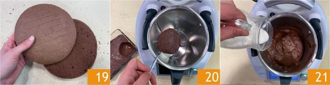De cette façon, vous obtiendrez 4 couches au total 19. Sortez la ganache du réfrigérateur et transférez-la dans le bol du Bimby® 20. Mixez à vitesse 4 pendant 30 secondes pour l'assouplir, puis ajoutez les 200 g de crème restants et continuez à monter à vitesse 5 pendant 2 minutes 21.