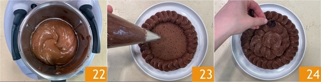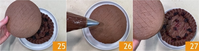 À ce stade, la ganache sera lisse et douce 22, alors transférez-la dans une poche à douille avec une douille étoile de 10 mm. Vous êtes prêts à assembler le gâteau : placez le premier disque de génoise sur le plat de service et brossez-le avec du lait, puis recouvrez toute la surface avec la ganache 23 et ajoutez quelques cerises brisées à la main 24.