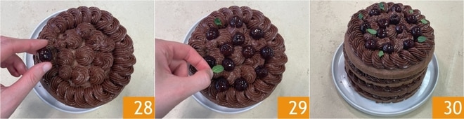 Décorez la surface avec des touffes de ganache et des cerises entières 28, puis complétez avec quelques feuilles de menthe 29. Votre gâteau au chocolat et aux cerises avec Bimby® est prêt à être servi 30 !