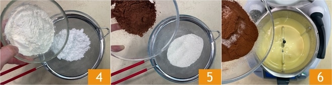 Entre-temps, tamisez dans un bol à part la fécule, la farine 4 et le cacao amer 5. Quand la préparation est montée, ajoutez les poudres 6.
