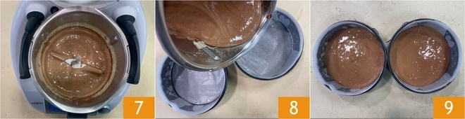 Actionnez Bimby® à vitesse 3 pendant 8 secondes pour tout mélanger 7. Recouvrez de papier sulfurisé 2 moules à charnière de 18 cm de diamètre et versez la pâte à l'intérieur 8. Faites cuire dans un four statique préchauffé à 160° environ 45 minutes 9.
