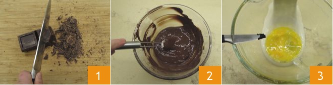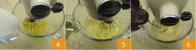 et ajoutez le sucre 4. Lorsque le mélange devient mousseux, versez l'huile en filet 5 et le chocolat fondu maintenant froid, tout en maintenant le batteur en marche 6.