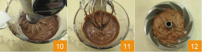 et le lait en filet 10 et continuez à fouetter pour obtenir un mélange lisse et homogène 11. Beurrez un moule à gâteau couronne de 25,5 cm de diamètre et versez-y le mélange obtenu 12.