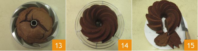 Faites cuire dans un four statique préchauffé à 180° pendant environ 55-60 minutes, en plaçant le moule sur la grille inférieure et en faisant toujours le test du cure-dent avant de retirer du four. Une fois cuit 13, laissez tiédir le gâteau couronne à l'intérieur du moule, puis démoulez-le et laissez-le refroidir complètement sur une grille 14. Votre gâteau couronne au chocolat est prêt à être dégusté 15!