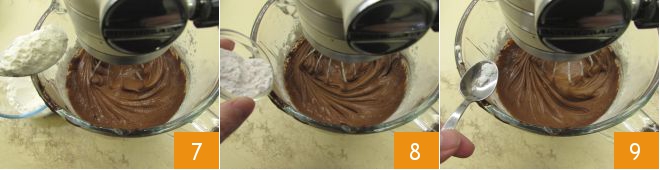 À ce stade, tamisez les ingrédients secs et ajoutez la farine 7 et la levure, une cuillère à la fois 8. Lorsque les ingrédients secs sont bien incorporés au mélange, ajoutez une pincée de sel 9