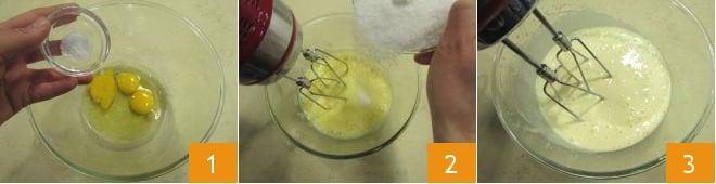 Pour réaliser le gâteau au lait chaud, cassez les œufs dans un bol, ajoutez une pincée de sel 1 et mettez le batteur en marche. Pendant que le batteur est en marche, ajoutez progressivement le sucre, cela favorisera son absorption 2. Lorsque le mélange sera clair et mousseux, environ 10 minutes après, éteignez le batteur électrique 3.