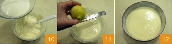 Maintenant, versez la pâte dans le récipient plus grand avec le reste du mélange 10, mélangez délicatement avec une spatule et enfin râpez le zeste de citron 11. Beurrez et farinez un moule de 20 cm de diamètre et remplissez-le avec la pâte obtenue 12.