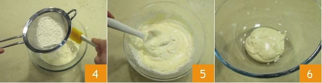 Placez une passoire au-dessus du bol et tamisez les poudres, donc la farine et la levure, en les ajoutant progressivement tout en mélangeant avec la spatule de bas en haut 4, afin de les incorporer sans faire retomber le mélange 5. À ce stade, prélevez quelques cuillerées de pâte et réservez-les dans un autre récipient 6.