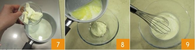 Dans une casserole, faites chauffer le lait à feu moyen, puis ajoutez le beurre 7 : faites-le fondre complètement et portez le tout à frémissement. Dès qu'il est à température, éteignez le feu et versez le mélange dans le récipient avec les cuillerées de pâte que vous aviez prélevées auparavant 8. Mélangez bien avec un fouet pour obtenir une sorte de pâte 9.