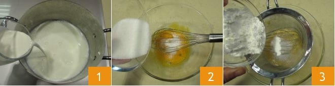 Pour réaliser le gâteau au miel, commencez par la préparation de la crème pâtissière : chauffez le lait dans une casserole 1, à part, dans un bol, battez les jaunes d'œufs avec le sucre avec un fouet 2, puis une fois le mélange homogène obtenu, ajoutez l'amidon tamisé 3.