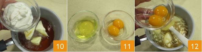 et le yaourt 10. À part, séparez les blancs des jaunes d'œufs 11 et ajoutez ces derniers au mélange de miel 12.