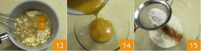 Mélangez avec le fouet 13 jusqu'à obtenir un mélange homogène que vous transférerez dans un bol 14. Maintenant, tamisez à part la farine, la fécule, la cannelle et la levure 15.