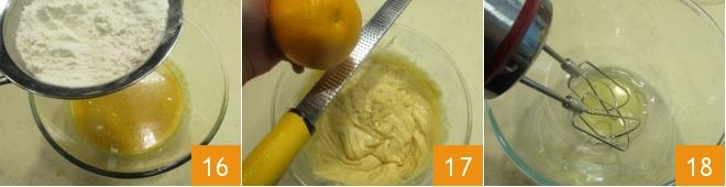 Ajoutez les poudres au mélange de miel 16 et mélangez pour l'incorporer, parfumez avec le zeste d'orange râpé 17 et mettez de côté. Préchauffez le four à 200°C en mode statique, puis reprenez les blancs d'œufs mis de côté et montez-les en neige avec les fouets électriques 18 jusqu'à ce qu'ils soient bien mousseux,