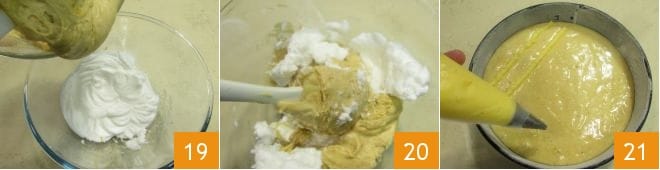 à ce moment-là, incorporez la pâte aux blancs montés 19 et mélangez délicatement avec la spatule de bas en haut 20 jusqu'à obtenir un mélange homogène. Beurrez et farinez un moule de 22 cm de diamètre et remplissez-le avec la pâte, puis reprenez la crème pâtissière et transférez-la dans une poche à douille avec une douille lisse. Réalisez des lignes perpendiculaires avec la crème sur la surface du gâteau 21