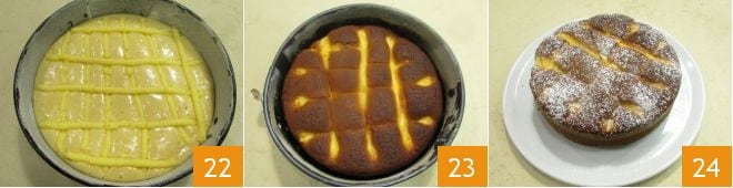 de manière à former un quadrillage 22. Maintenant, vous pouvez cuire le gâteau au miel dans un four statique préchauffé à 200°C pendant 40 minutes. Une fois la cuisson terminée, sortez votre gâteau du four, laissez-le refroidir 23, puis démoulez-le et saupoudrez la surface de sucre glace avant de le servir 24.
