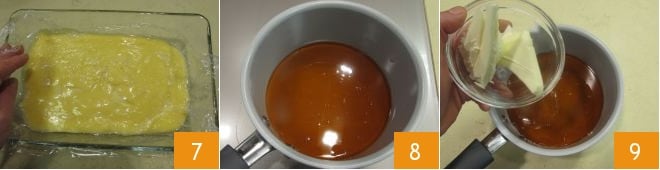 éteignez le feu et transférez-la dans un bol, couvrez avec un film alimentaire en contact et laissez refroidir 7. Une fois que la crème est à température ambiante, vous pouvez la mettre au réfrigérateur pour qu'elle prenne. Occupez-vous maintenant de la pâte à gâteau : chauffez légèrement le miel dans une casserole 8, puis retirez du feu et ajoutez le beurre 9