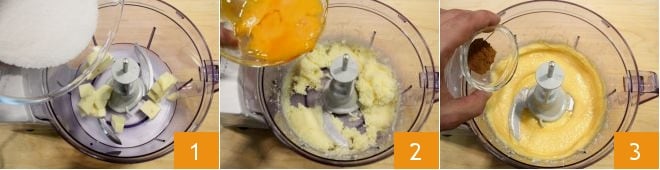 Pour préparer le gâteau au vin rouge, coupez le beurre à température ambiante en cubes et mettez-le dans un robot de cuisine équipé de lames ; ajoutez le sucre 1 et travaillez le tout jusqu'à obtenir une crème. Séparez les jaunes d'œufs des blancs (conservez les blancs, car ils seront utilisés plus tard) et ajoutez petit à petit les jaunes au mélange 2 ; mélangez-les bien, puis ajoutez la cannelle et les clous de girofle en poudre 3.