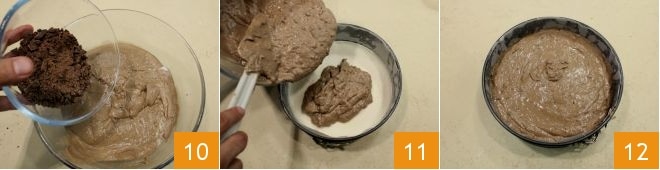 Et ajoutez-le à la pâte que vous avez obtenue 10. Beurrez et chemisez avec du papier sulfurisé un moule de 22 cm de diamètre et versez-y le mélange 11, en lissant bien avec la spatule 12.