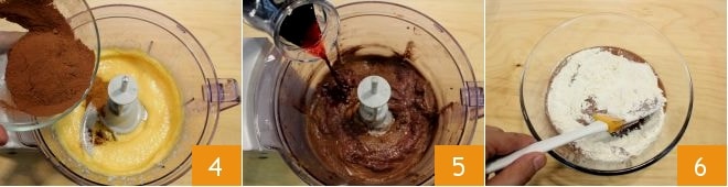 Ajoutez également le cacao amer 4 et ensuite le vin rouge 5. Mélangez jusqu'à obtenir une crème de couleur uniforme et à ce stade, transférez la pâte dans un bol ; versez la farine tamisée mélangée à la levure et mélangez bien avec une spatule pour éviter la formation de grumeaux 6.