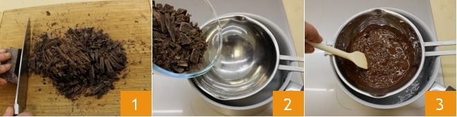 Pour préparer le gâteau au yaourt et chocolat, commencez justement par ce dernier : hachez le chocolat noir et faites-le fondre au bain-marie 2 : il est important que l'eau de la casserole sur le feu ne touche pas le fond du bol ou de la petite casserole dans laquelle se trouve le chocolat. Remuez de temps en temps avec une cuillère en bois pour faciliter la fonte du chocolat 2. Quand il sera prêt, éteignez et laissez refroidir.
