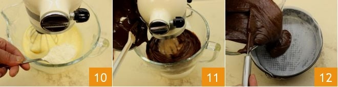 et quand l'huile sera complètement absorbée, ajoutez les poudres une cuillère à la fois 10. Quand la farine sera complètement incorporée, vous pouvez ajouter le chocolat fondu maintenant froid 11 et travailler la pâte encore quelques minutes pour obtenir un mélange homogène et fluide. Beurrez et tapisser un moule de 24 cm de diamètre avec du papier sulfurisé. Versez la pâte à l'intérieur 12