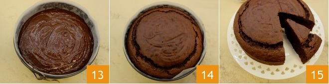 et nivelez-la avec une spatule sans taper le moule pour ne pas inhiber l'action de la levure. Enfournez le gâteau 13 dans un four statique préchauffé à 170°C pendant 45-50 minutes (150°C dans un four ventilé pendant 35-40 minutes). Une fois cuit, sortez-le du four 14 et laissez tiédir, puis placez le gâteau au yaourt et chocolat sur une grille pour refroidir complètement. Une fois froid, vous pouvez le saupoudrer de sucre glace et le servir 15 !