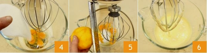 Entre-temps, dans le bol d'un batteur muni d'un fouet, versez les œufs et ajoutez le sucre 4, râpez le zeste d'une orange non traitée 5 et commencez à travailler le mélange : il doit être blanc et mousseux 6.