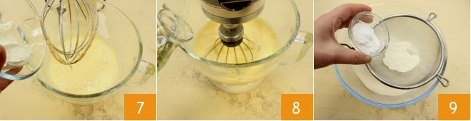 À ce stade, ajoutez le yaourt petit à petit 7 et quand il sera bien amalgamé, ajoutez l'huile de graines en filet 8. Ensuite, dans un bol, tamisez la farine avec la levure 9
