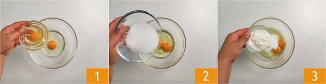 Pour préparer le gâteau au yaourt avec des pépites de chocolat, mettez dans un bol les œufs 1 avec le sucre 2 et le yaourt 3.