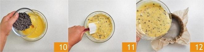 Ajoutez également les pépites 10 et mélangez une dernière fois avec la spatule 11; juste le temps nécessaire pour obtenir une pâte homogène. Ensuite, versez-la dans un moule de 22 cm tapissé de papier sulfurisé 12.