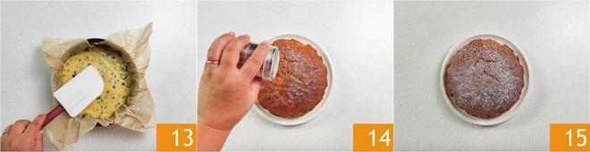 Niveler bien la surface 13 et faites cuire dans un four statique préchauffé à 180° C pendant 45 minutes. Avant de sortir le gâteau du four, faites toujours le test du cure-dent. Laissez refroidir le gâteau avec la porte du four légèrement ouverte. Ensuite, sortez-le du four, retirez-le du moule et saupoudrez de sucre glace 14 avant de servir 15.