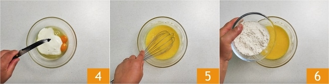 Ajoutez les graines que vous aurez récupérées d'une gousse de vanille 4 et battez avec un fouet manuel 5. Dès que tous les ingrédients sont bien mélangés, ajoutez également la farine tamisée 6.