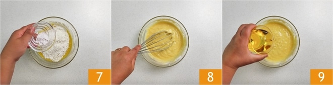 Enfin, tamisez également la levure et ajoutez-la à la pâte 7; mélangez bien avec un fouet jusqu'à obtenir une pâte lisse et sans grumeaux; puis ajoutez l'huile 9 et mélangez bien pour l'incorporer.
