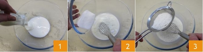 Pour préparer le gâteau au yaourt et aux pommes sans œufs, commencez par laisser tous les ingrédients frais hors du réfrigérateur pendant un moment : de cette façon, vous serez sûr de la réussite optimale du gâteau car ils auront tous la même température ambiante. Ensuite, versez le lait dans un bol avec le yaourt grec 1, délayez avec un fouet et ajoutez le sucre semoule 2. Mélangez soigneusement, puis placez une passoire sur le récipient et tamisez la farine 3