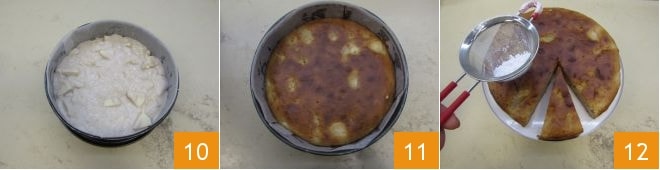 Étalez avec une spatule pour niveler le gâteau 10 et faites cuire dans un four statique préchauffé à 170° pendant environ 55 minutes (pour cette recette, la cuisson au four ventilé est déconseillée car le gâteau pourrait trop se dessécher ; si vous préférez essayer quand même, la cuisson idéale est à 160° pendant environ 45-50 minutes), en effectuant le test du cure-dent : s'il en ressort sec, alors le gâteau est cuit. Nous recommandons également, si vous voyez la surface trop brunir, de couvrir le gâteau avec du papier aluminium pendant la cuisson. Sortez le gâteau au yaourt et aux pommes sans œufs du four et laissez-le refroidir complètement avant de le démouler 11. Si vous préférez, servez votre gâteau au yaourt et aux pommes sans œufs avec une pincée de sucre glace 12.