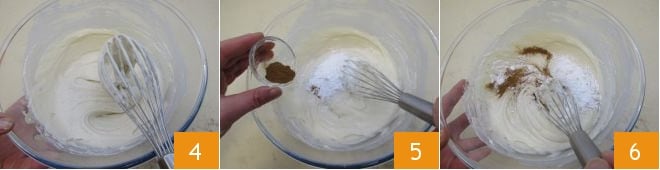 mélangez vigoureusement pour l'incorporer, évitant ainsi la formation de grumeaux 4. Ensuite, ajoutez la levure chimique et la cannelle en poudre 5 et continuez à les incorporer au mélange 6.