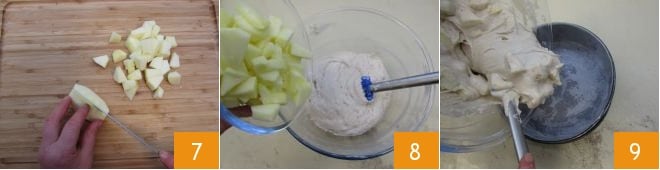À ce stade, vous pouvez éplucher les pommes et retirer le trognon (vous obtiendrez environ 300 g de pommes). Tranchez-les et coupez-les en dés d'environ 2 cm 7. Au fur et à mesure que vous coupez, versez-les immédiatement dans le récipient contenant la pâte pour éviter que les cubes ne noircissent 8. Mélangez bien le tout avec une spatule et versez le mélange dans un moule de 24 cm de diamètre (si possible, utilisez un moule à charnière), chemisez avec du papier sulfurisé 9.