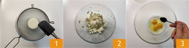 Si la ricotta que vous avez achetée contient beaucoup de lactosérum, laissez-la égoutter une heure avant de la tamiser.