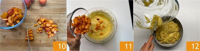 Coupez en dés les abricots restants 10 et plongez-les dans la pâte 11. Transférez le mélange dans un moule de 20 cm beurré et fariné 12.