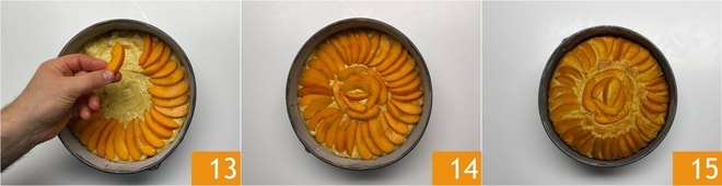 Disposez les tranches d'abricots sur la surface 13 pour créer un motif en rosace 14 et faites cuire dans un four statique préchauffé à 170° pendant environ 70 minutes. Le gâteau aux abricots et à la ricotta est prêt 15, laissez-le tiédir, puis démoulez-le et servez-le saupoudré de sucre glace.